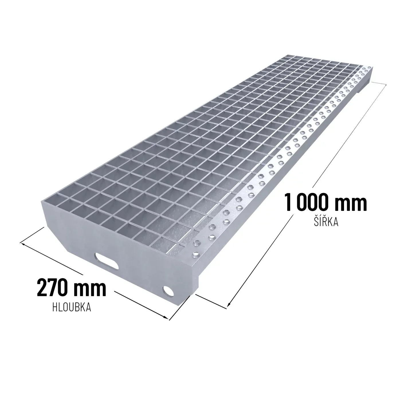 Ocelové schodišťové stupně jsou žárově pozinkovány, což zajišťuje jejich vysokou odolnost vůči korozi. Jsou opatřeny dvojitě děrovanou protiskluzovou nášlapnou hranou, která výrazně snižuje riziko uklouznutí, a bočnicemi s předvrtanými otvory pro snadné přišroubování na konstrukci. Toto praktické řešení minimalizuje riziko uklouznutí, i při znečištění schodů například olejem. Schodišťové stupně splňují požadavky normy DIN 24531.