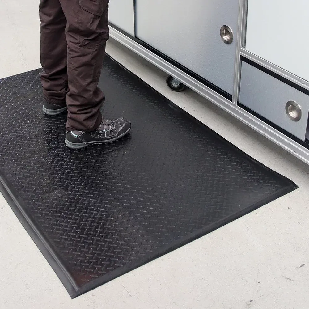 Silná dvouvrstvá pěnová rohožka je navržena pro dlouhodobé stání v náročných pracovních prostředích, kde dochází k pravidelnému otáčení. Tvrdý šachovnicový povrch poskytuje nejen atraktivní vzhled, ale také vysokou odolnost proti opotřebení. Díky své konstrukci izoluje proti chladu betonových podlah a pomáhá snižovat únavu pracovníků. Je ideální do suchých vnitřních prostor, kde je důležitá bezpečnost a pohodlí. Rohožka je dostupná v rohožích i rolích a lze ji volně položit bez nutnosti upevnění.