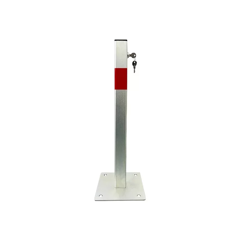 Šedý ocelový sklopný parkovací sloupek je vyroben z odolné oceli a nabízí dvě povrchové úpravy – galvanické zinkování nebo zinkování s dodatečným bílým práškovým lakem. Sloupek je vybaven reflexním červeným pásem pro zvýšenou viditelnost a uzamyká se pomocí integrovaného zámku. Součástí balení jsou dva klíče.