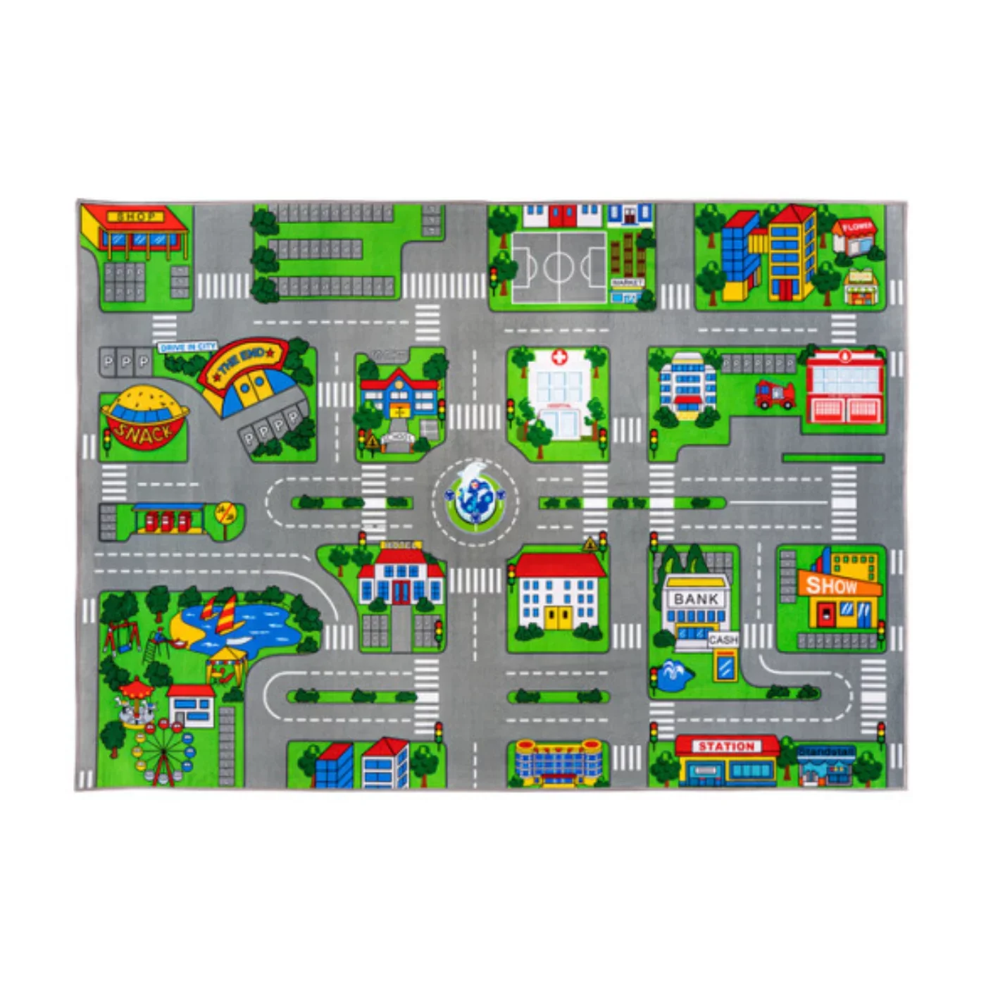 Dětský kusový hrací koberec FLOMA City s rozměry 133× 190 cm a výškou 0,5 cm je ideální volbou do dětského pokoje. Barevný motiv města s ulicemi a křižovatkami nabízí prostor pro kreativní hru s autíčky, podporuje fantazii a pomáhá rozvíjet orientaci v prostoru. Koberec je vyroben z odolného materiálu, který je snadno udržovatelný a příjemný na dotek.