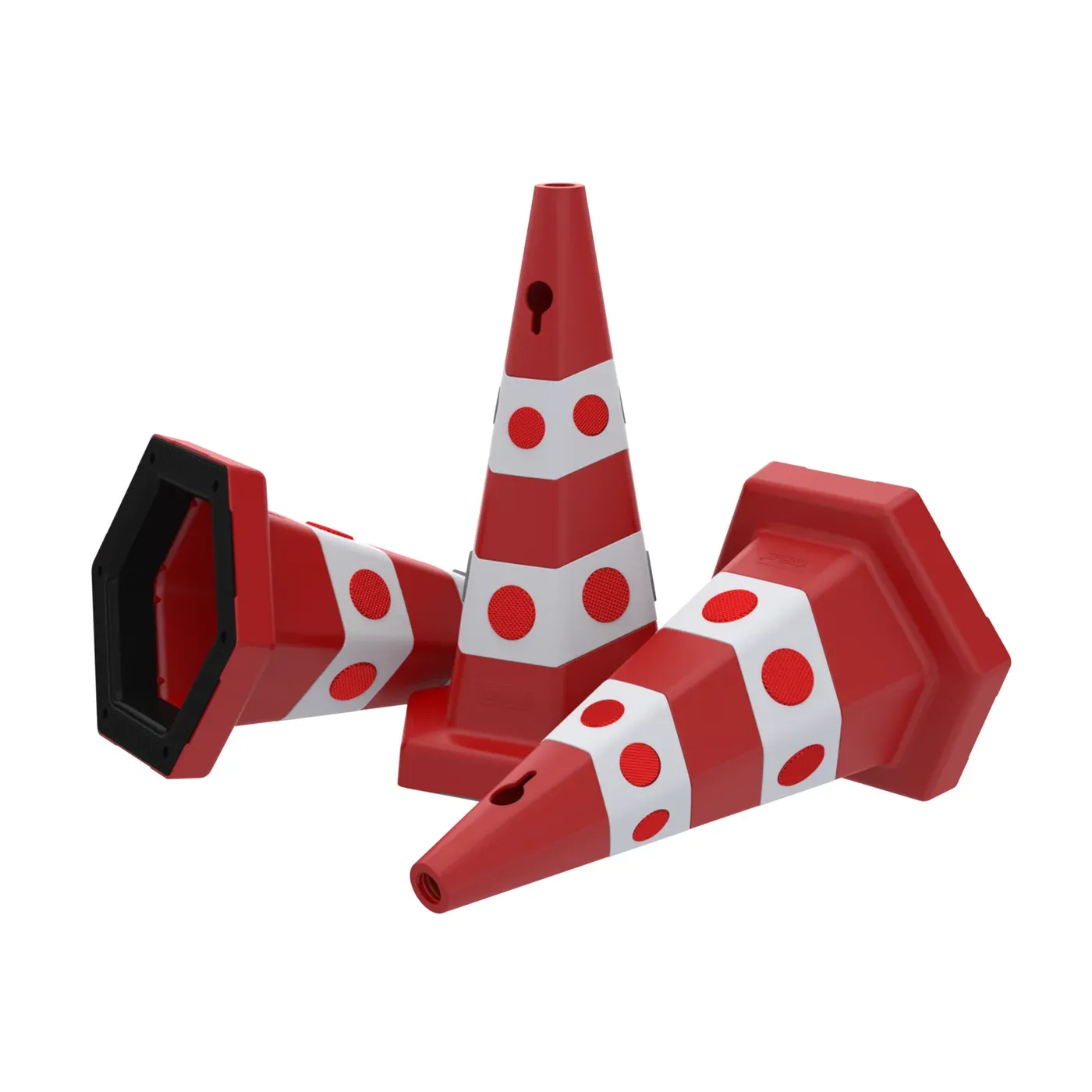 Kromě bezpečnosti slouží tento model skvěle i jako reklamní a navigační nosič. Horní část kuželu je uzpůsobena pro upevnění výstražných tyčí, informačních vlajek, tabulí nebo bariérových řetězů. Hybridní materiál PPC + PVC je testován pro extrémní teploty od -20 °C do +60 °C a je plně imunní vůči UV záření, což garantuje stálost barev a dlouhou životnost i při trvalém venkovním nasazení.
