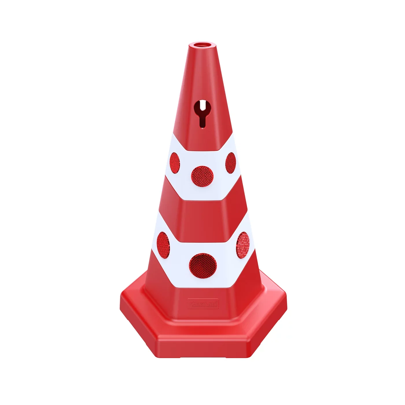 Nepřehlédnutelnost za jakýchkoliv podmínek zajišťují výrazné červeno-bílé reflexní pásy. Tato kombinace signální barvy a retroreflexní technologie zaručuje, že kužel bude včas vidět i za úplné tmy, hustého deště nebo v mlze. Masivní konstrukce a odolnost vůči mechanickému namáhání z něj činí ideální volbu pro náročné průmyslové provozy a exponované silniční úseky, kde by lehčí modely selhávaly.