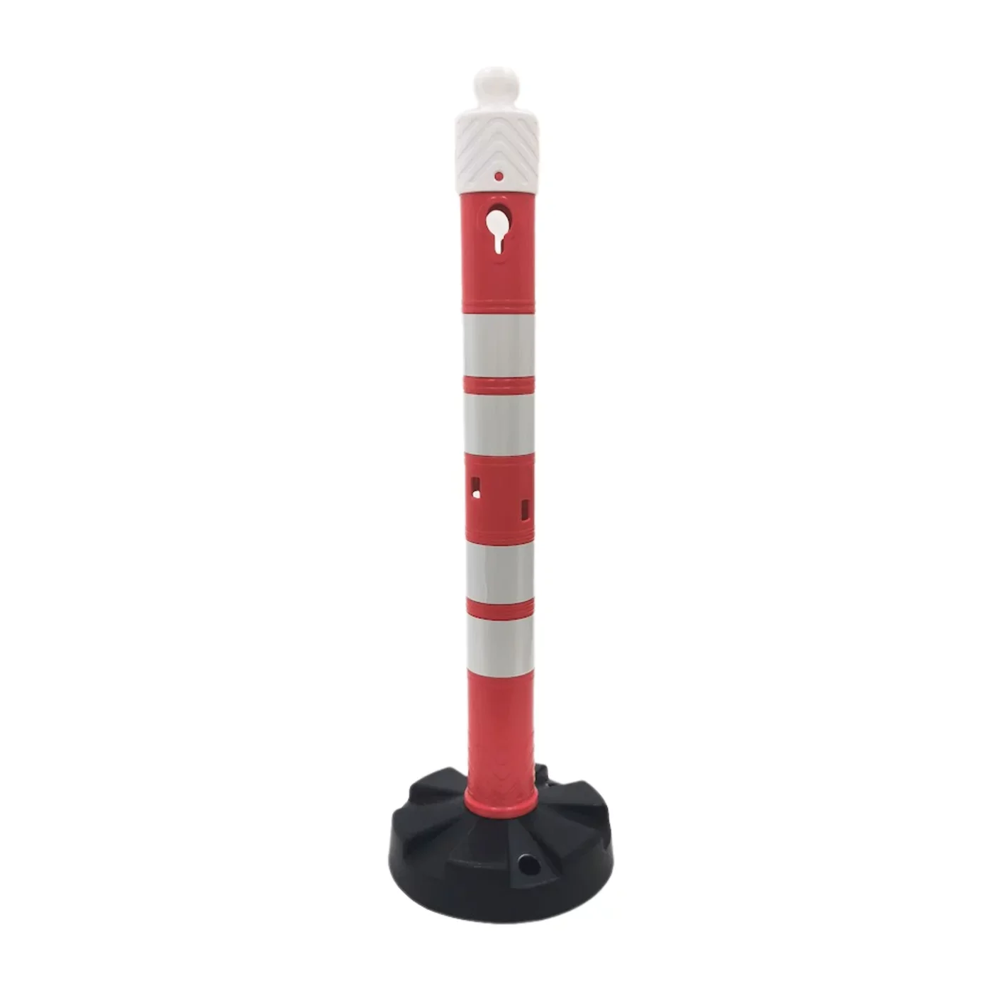Maximální bezpečnost zajišťují dvojité vysoce reflexní pásy s vynikající retroreflexní schopností, které efektivně vrací světlo světlometů i za nejhustšího deště či mlhy. S hmotností 5,5 kg a širokou kulatou základnou o průměru 36 cm disponuje sloupek vysokou vlastní stabilitou. I bez pevného ukotvení odolává tlakovým vlnám od projíždějících vozidel, přičemž výrazné červeno-bílé provedení slouží jako nekompromisní varovný signál pro všechny účastníky provozu.