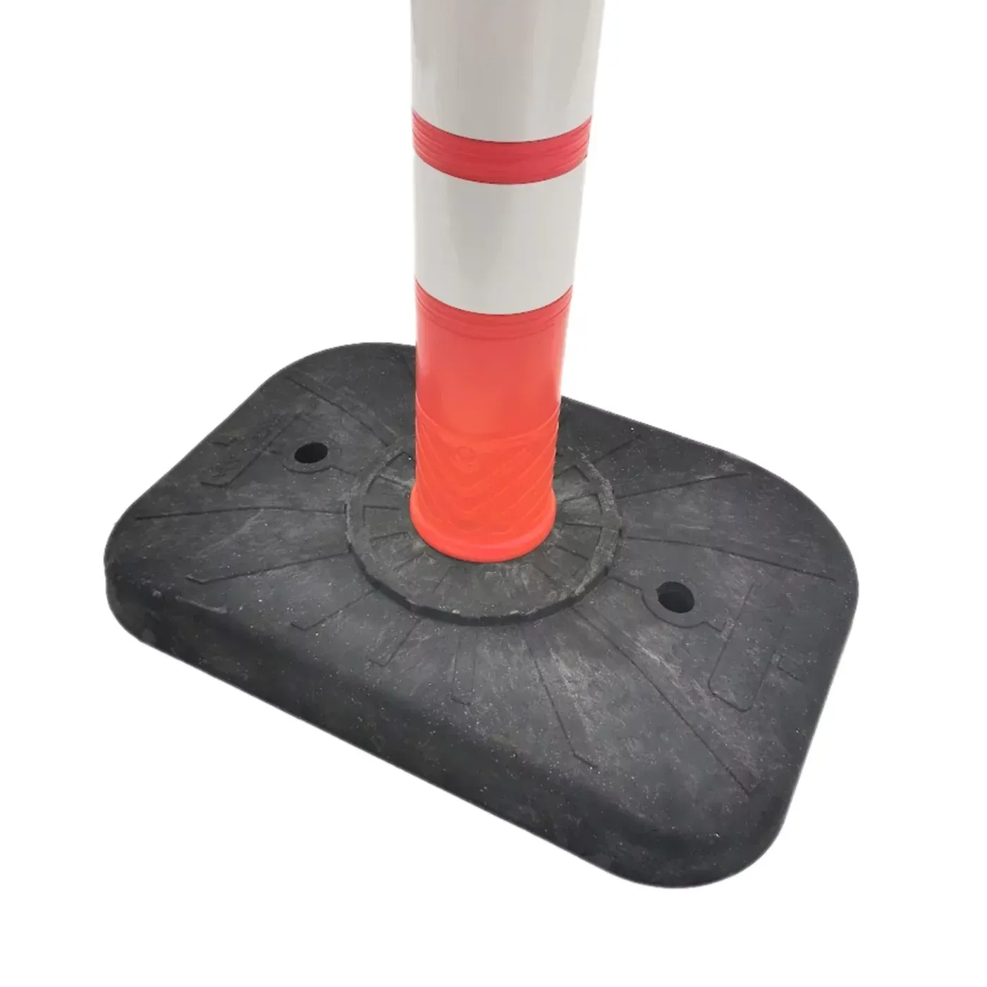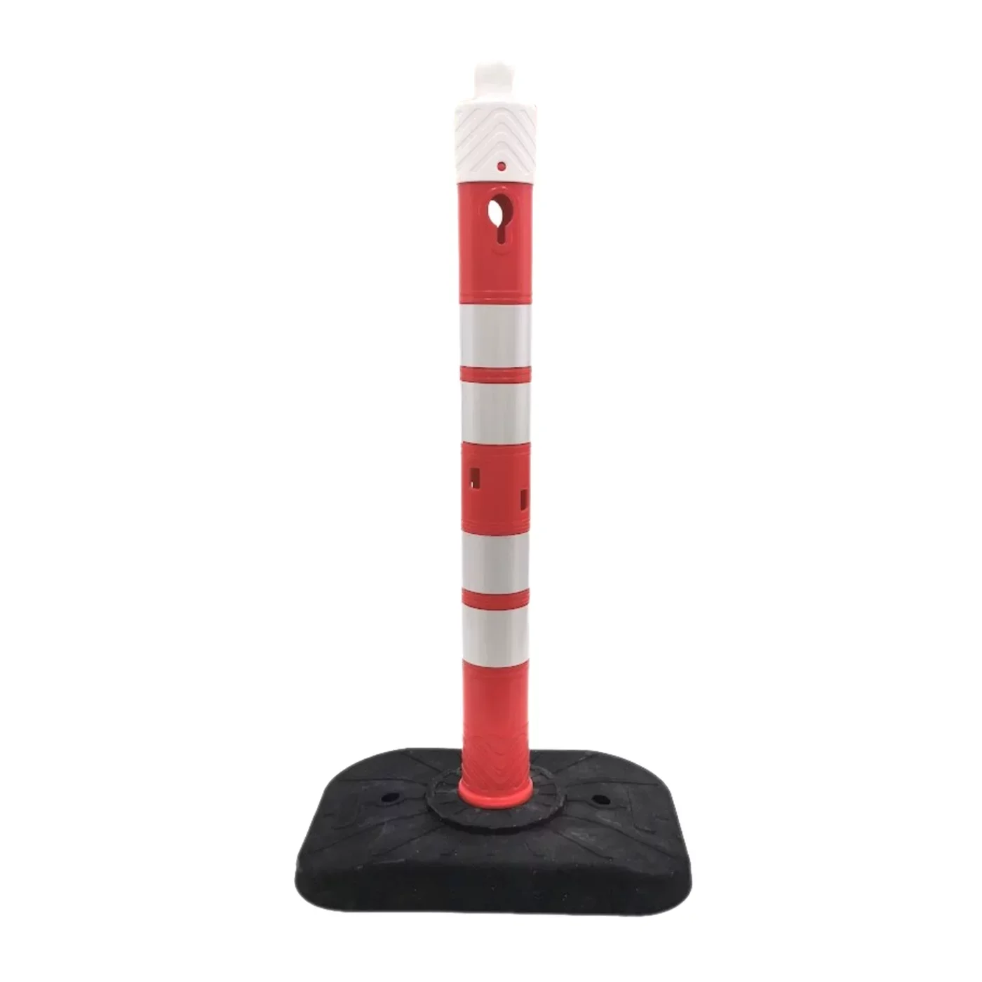 Bezpečnostní standardy zvyšují dvojité vysoce reflexní pásy, které zaručují špičkovou retroreflexní schopnost. Sloupek je tak jasně viditelný na velkou vzdálenost i za nulové viditelnosti, v hustém dešti nebo mlze. Kombinace červeno-bílé barevnosti a nadstandardních rozměrů vytváří nekompromisní vizuální bariéru, která efektivně usměrňuje dopravu a minimalizuje riziko poškození majetku i ohrožení personálu v průmyslových, stavebních i silničních koridorech.