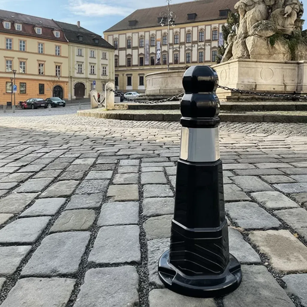 Klíčovým bezpečnostním prvkem je bílá prizmatická reflexní páska umístěná v horní části sloupku. Tato technologie využívá odrazu světla pod širokým úhlem, což zajišťuje vynikající viditelnost za šera, v noci nebo při dešti. Černé provedení těla sloupku působí elegantně a nerušivě, zatímco reflexní prvek poskytuje jasný varovný signál pro řidiče i chodce, čímž výrazně snižuje riziko kolizí v nepřehledných úsecích, na parkovištích či v areálech firem.