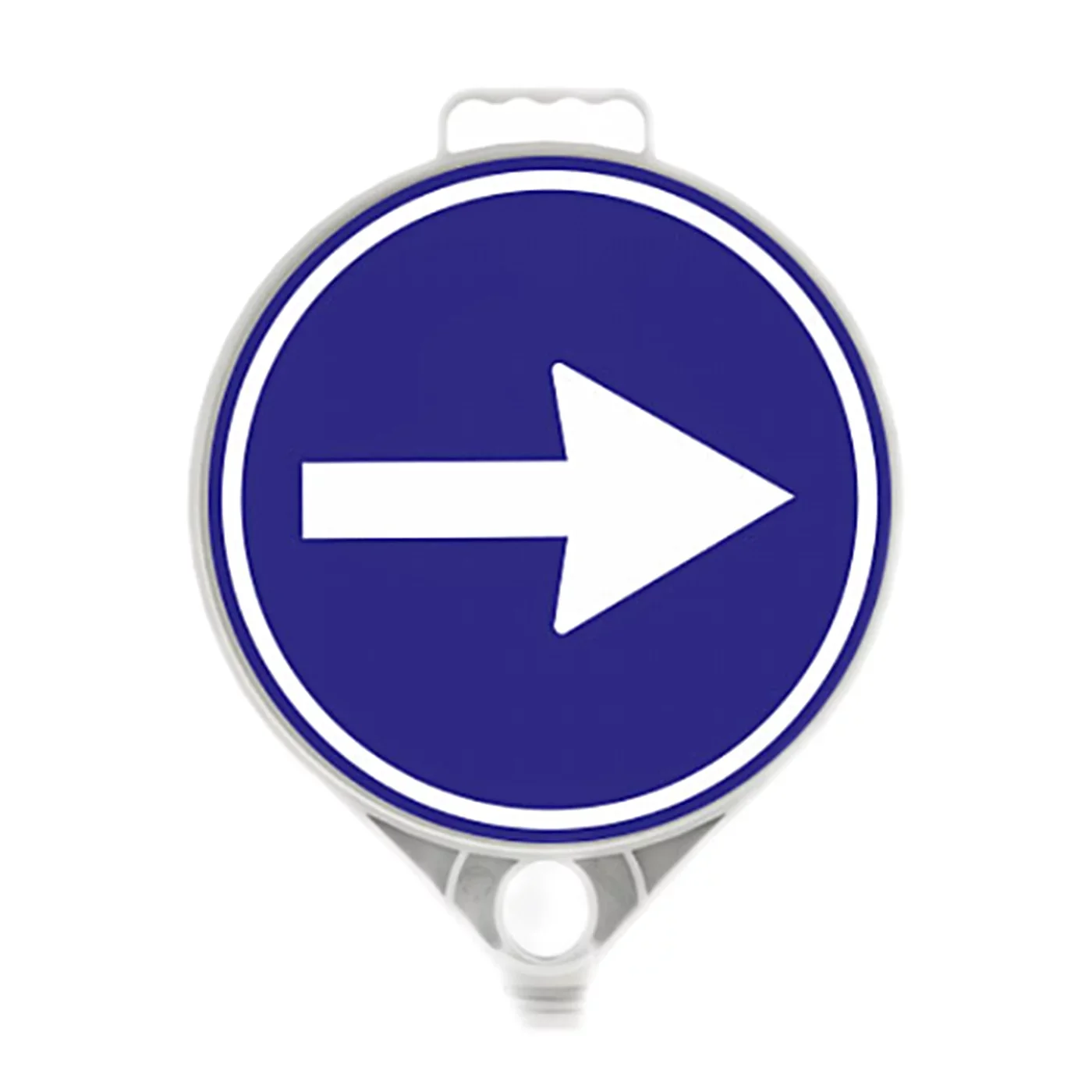 Dopravní značka Přikázaný směr jízdy zde vpravo v modrém provedení o průměru 28 cm je nezbytným doplňkem pro organizaci provozu v průmyslových areálech, skladech a na parkovištích. Je vyrobena z vysoce odolného polypropylen karbonátu (PPC), který zaručuje vynikající mechanickou pevnost při zachování minimální hmotnosti. Tato značka je navržena pro okamžité nasazení na vrcholy dopravních kuželů nebo sloupků, čímž umožňuje flexibilní navigaci bez nutnosti instalace trvalého a těžkého značení.