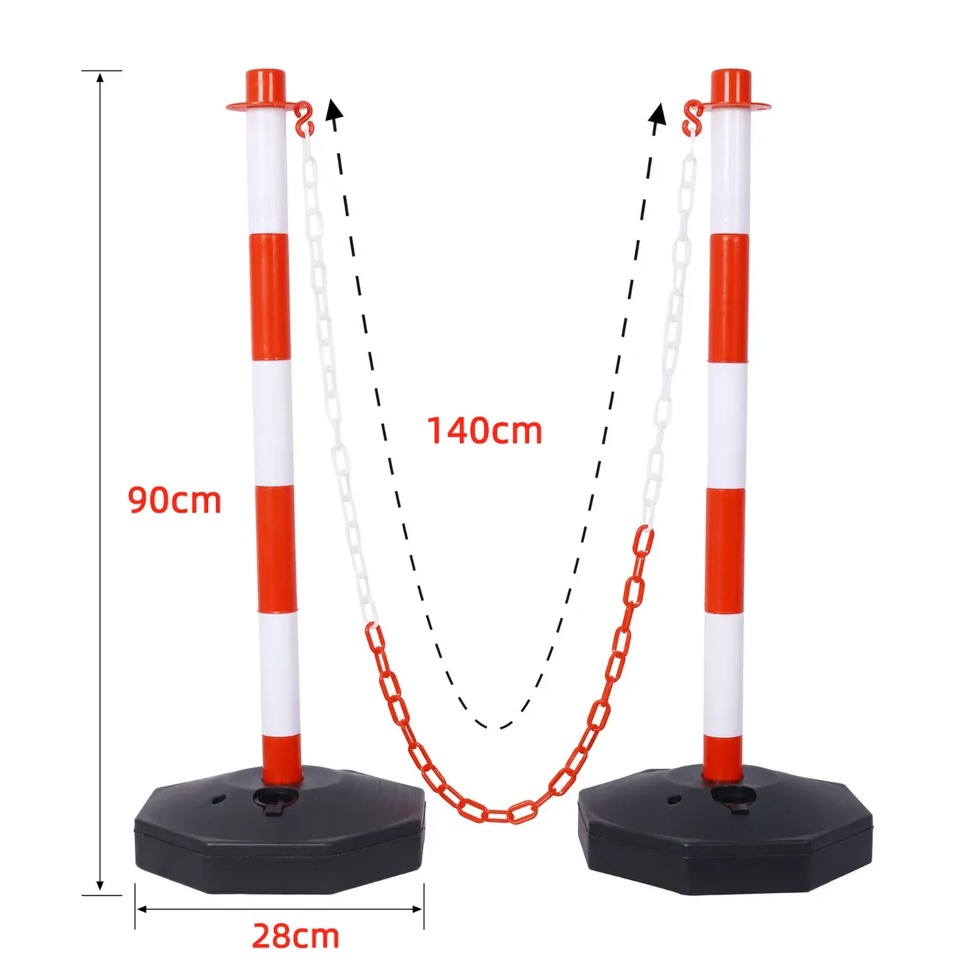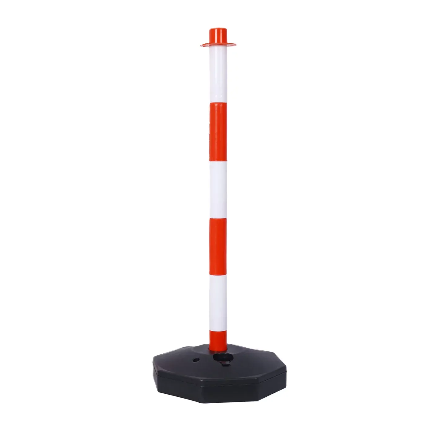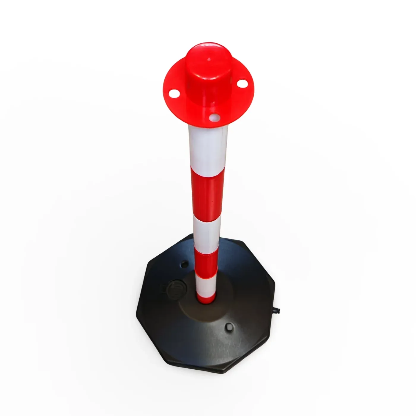 Vymezovací sloupek o výšce 90 cm je vyroben z kombinace odolných plastů, což mu dodává potřebnou pružnost a odolnost. Hlavní předností je dutá kruhová základna, kterou lze pro zvýšení stability naplnit vodou nebo pískem. Tím se výrazně zvýší celková hmotnost a odolnost sloupku proti převrácení větrem či nárazem. Sloupek je vhodný pro vnitřní i venkovní použití a odolává běžným povětrnostním vlivům.