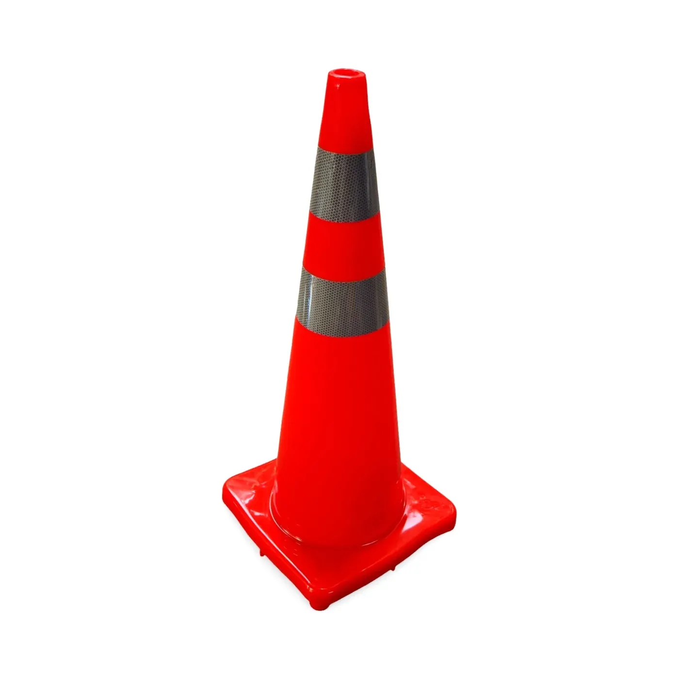 Absolutní špičku v bezpečnosti zajišťuje výrazné oranžové provedení doplněné o tři bílé reflexní pruhy o šířce 8 cm. Tato trojitá reflexní plocha pokrývá podstatnou část těla kuželu, čímž vytváří intenzivní světelný odraz za tmy, mlhy či deště. Stabilní čtvercová základna o rozměru 36 × 36 cm v kombinaci s celkovou hmotností 3,3 kg zajišťuje vynikající stabilitu a vysokou odolnost proti poryvům větru i extrémní tlakové vlně od projíždějící těžké techniky.