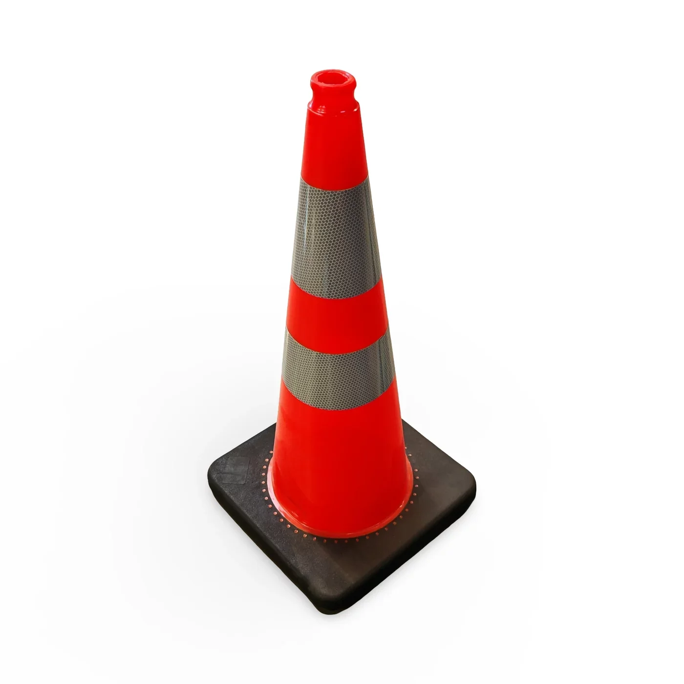 Vynikající viditelnost za každé situace zajišťuje výrazná oranžová barva těla kuželu doplněná o dva široké reflexní pruhy o šířce 10 cm. Tato dvojitá reflexní plocha splňuje přísné nároky na bezpečnost a zaručuje, že je kužel včas rozpoznatelný i za tmy, mlhy nebo prudkého deště. Klíčovým prvkem je masivní gumová základna o rozměru 36 × 36 cm, která zajišťuje špičkovou stabilitu a odolnost proti převržení poryvy větru či tlakovou vlnou od projíždějících nákladních vozidel.