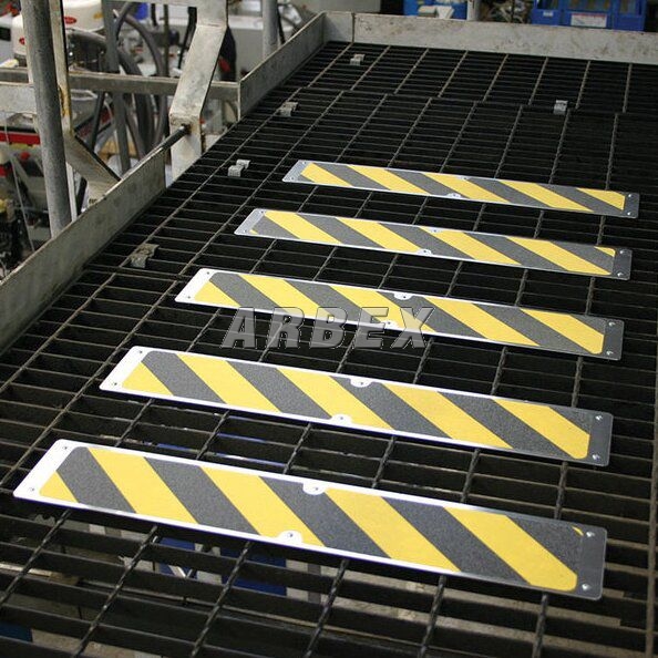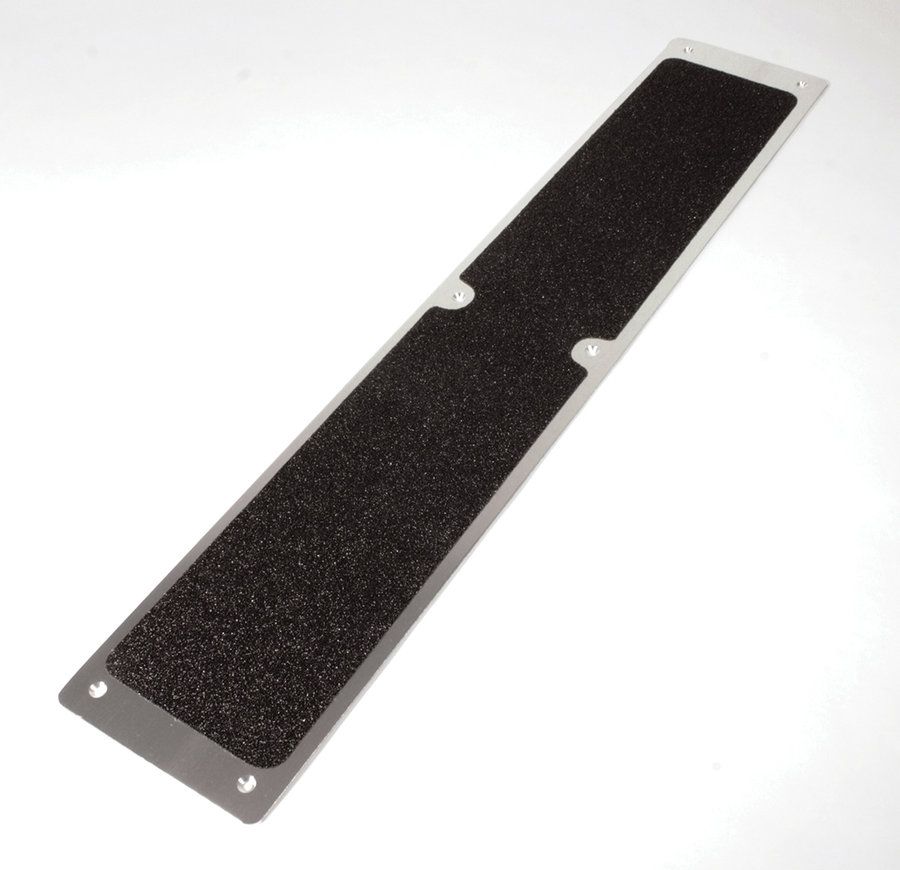 Korundový protiskluzový pásek připevněný na hliníkový plát. Pásek snižuje riziko uklouznutí na shodištích nebo plošinách z kovových roštů. Pásek je velice jednoduché namontovat.