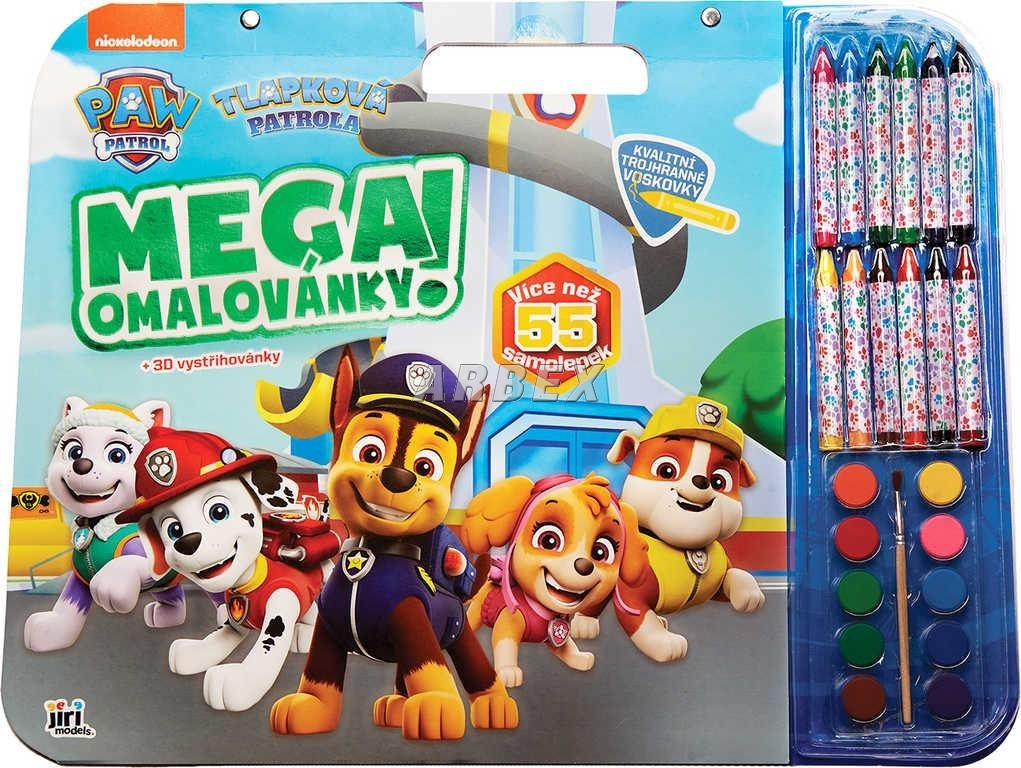 Set obsahuje 30 obrázků k vybarvení, 5 listů k malování, 12 trojhranných voskovek s potiskem, 10 vodových barev se štětečkem, postavičky k vystřihnutí a více než 50 samolepek, s motivem Tlapkové patroly (Paw Patrol).