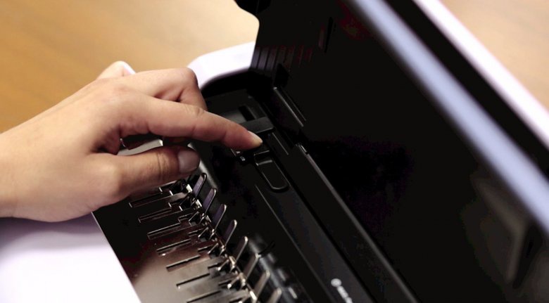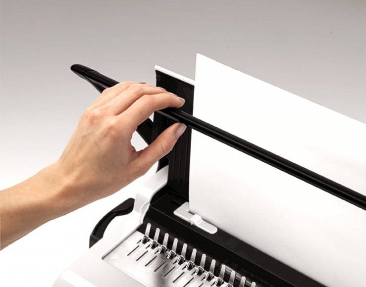 • Oddělená ergonomická děrovací a vázací páka pro průběžné vkládání děrovaných listů do plastového hřbetu výrazně zefektivňuje práci.