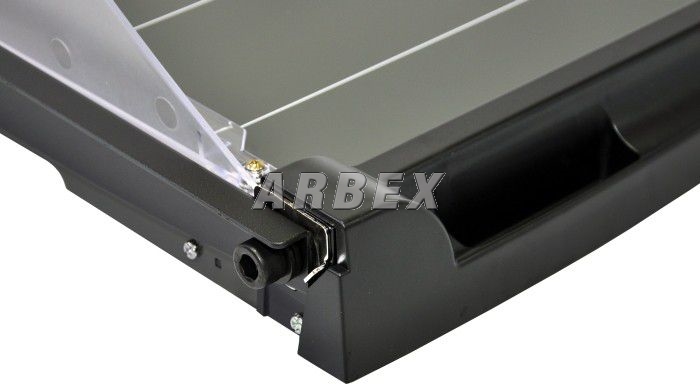 Na stole je lišta s měřítkem, zadním dorazem a jsou na něm vyznačeny běžné DIN formáty.