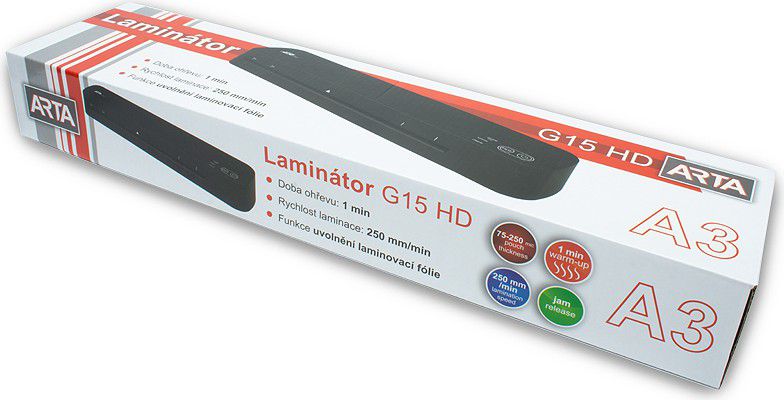 • Model ARTA G15 HD A3 umožňuje laminování dokumentů, které mají maximální šířku 330 mm (A3), s fóliemi o tloušťce 75 až 250 mikronů.