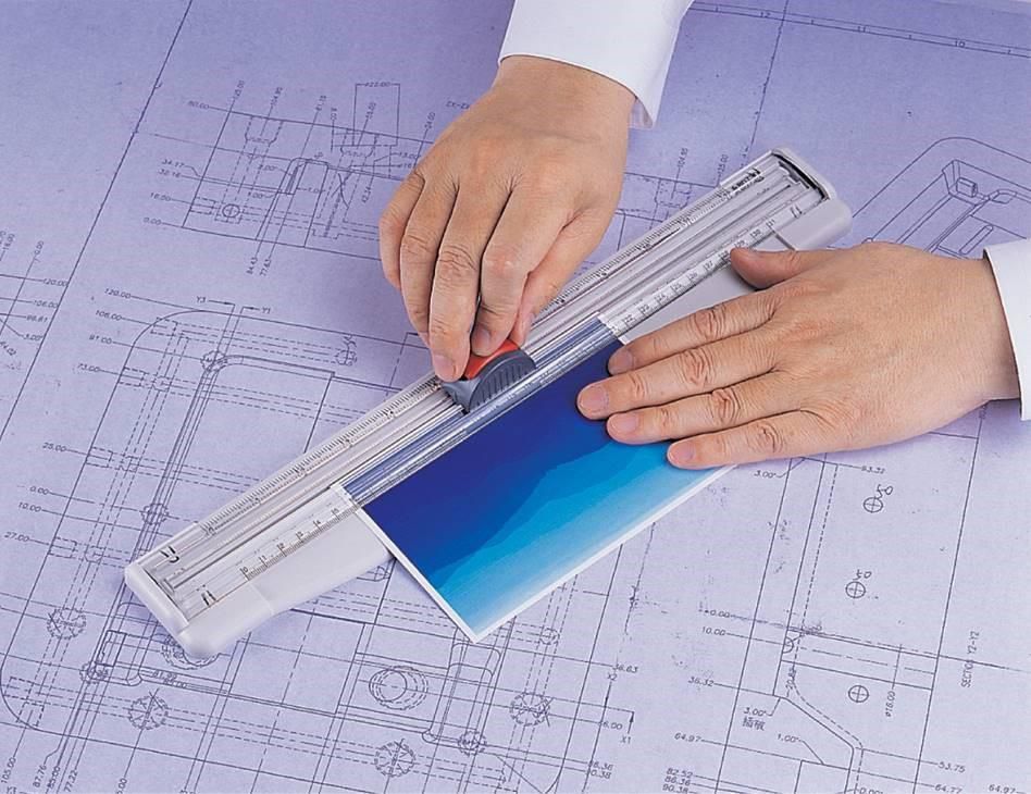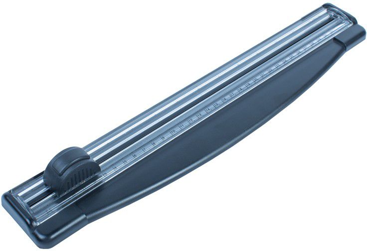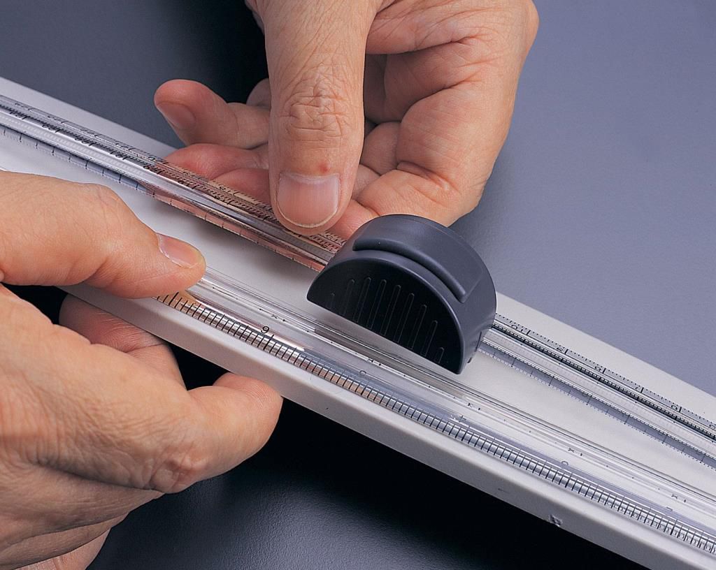 Plastový podklad s průhledným přítlačným pravítkem, opatřeným řeznou hlavou, umožňuje odříznout až 5 listů papíru v délce 310 mm.