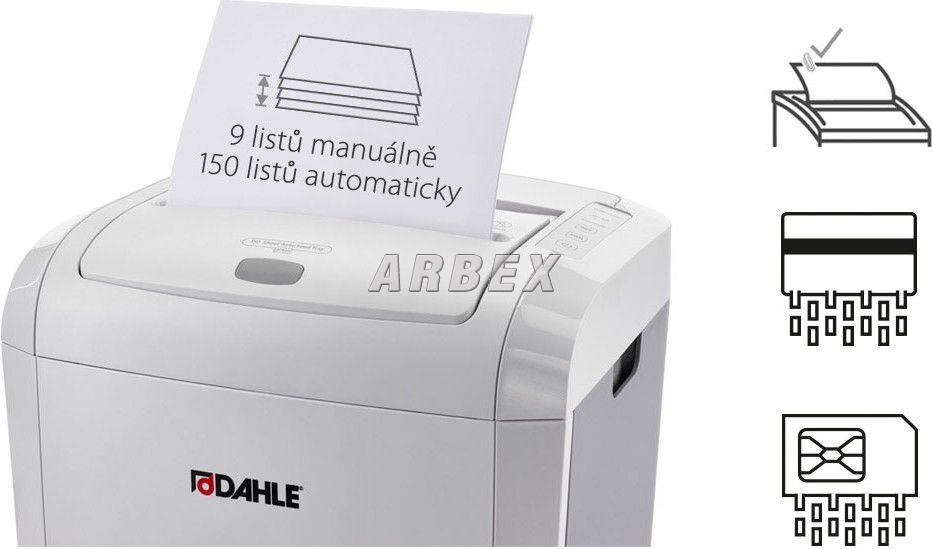 Rychlý a výkonný skartovač s automatickým podavačem až na 150 listů vhodný pro menší pracovní skupiny šetří váš čas. Ideální pro skartaci dokumentů s důvěrnými informacemi - ceníky, faktury, evidence a osobní dokumenty. Skartuje papír včetně drátků ze sešívaček, možnost náhodné skartace kancelářských sponek. Likvidace platebních karet. Při použití automatického podavače stačí vložit papír a vše ostatní udělá skartovač sám. Indikace přetížení, přehřátí a plného koše. Tichý chod. Bez nutnosti mazání a údržby.