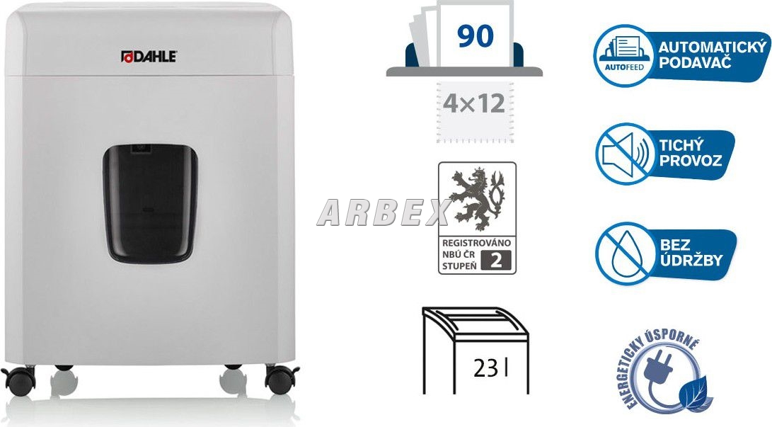 Výkonný skartovač s automatickým podavačem až na 90 listů vhodný pro menší pracovní skupiny šetří váš čas. Ideální pro skartaci dokumentů s důvěrnými informacemi - ceníky, faktury, evidence a osobní dokumenty. Skartuje papír včetně drátků ze sešívaček a likviduje bezpečně platební karty. Při použití automatického podavače stačí vložit papír a vše ostatní udělá skartovač sám. Indikace přetížení, přehřátí a plného koše. Bez nutnosti mazání a údržby.