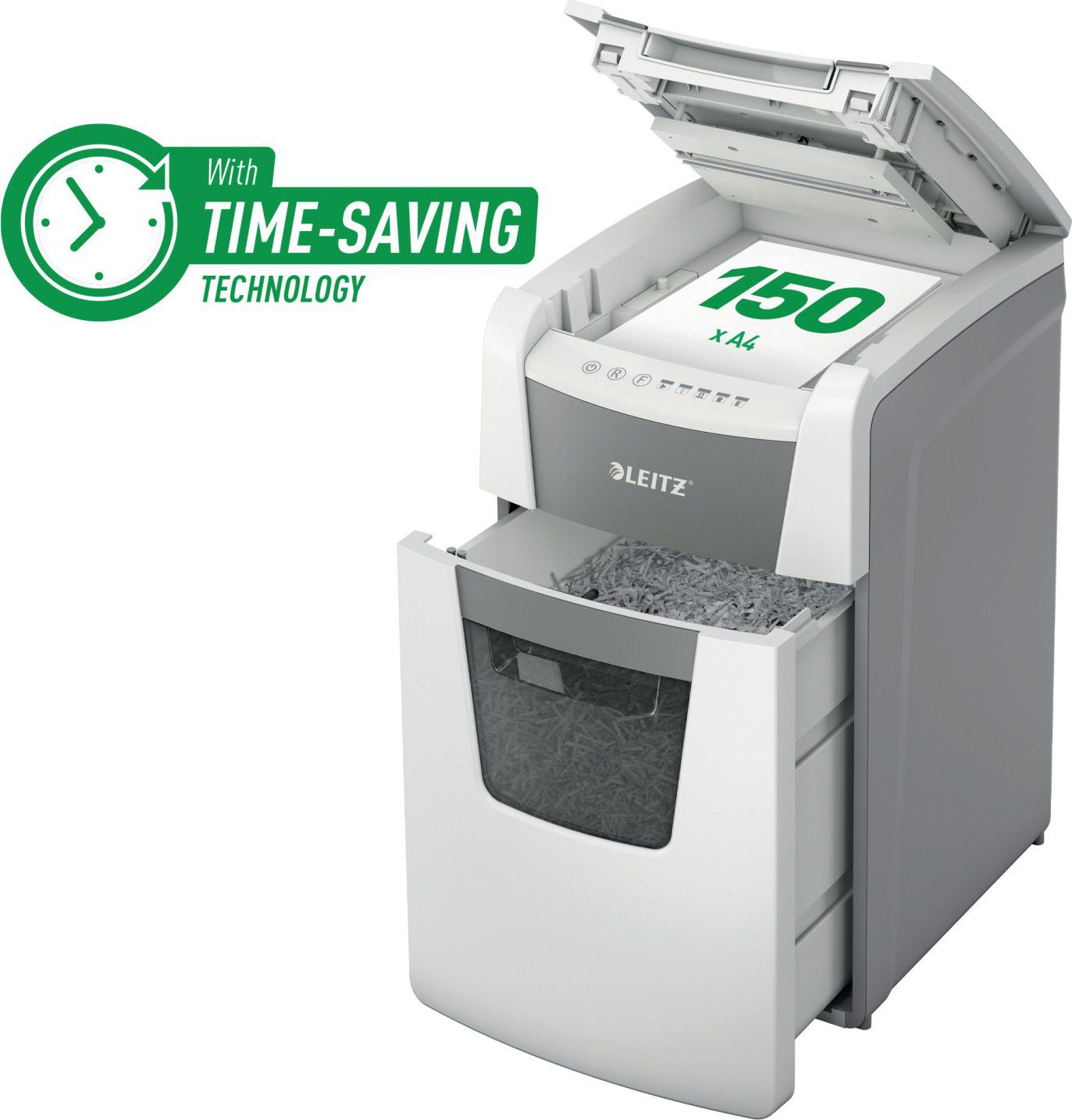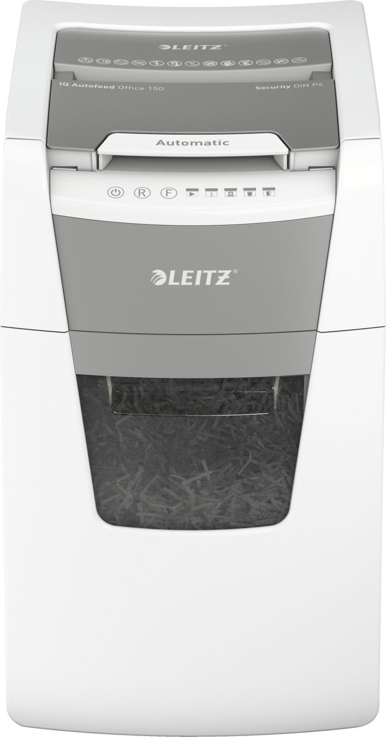 Plně automatická skartovačka papíru od firmy Leitz s jedinečnou čistou vyprazdňovací funkcí. Je tak inteligentní, že tiše pracuje sama, jen vložte stoh papíru (včetně sponek a svorek), zavřete víko a jděte si po své práci. Ideální pro použití pro kanceláře. Důvěrná bezpečnost a vynikající výkon s touto skartovačkou s automatickým podáváním, s funkcí proti zaseknutí papíru, tichou a s dlouhým provozem (30 minut). Automaticky skartuje 150 listů A4 s úrovní zabezpečení P4 (4x28 mm) s křížovým řezem do velkého koše s objemem 44 l. Jednoduché ovládání pomocí dotekových prvků.
