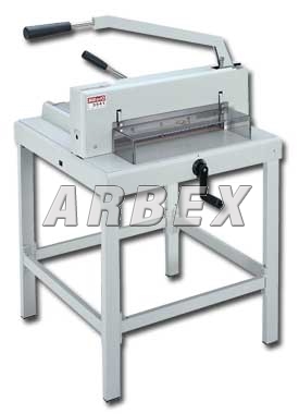 Výkonná stohová řezačka s délkou řezu 430 mm, s vřetenovým zadním dorazem, plastovým bezpečnostním krytem a pákovým upínáním stohu. Stojan je součástí řezačky.