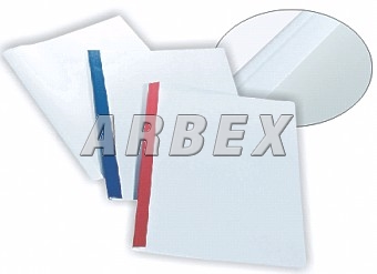 Přední strana z průhledné fólie, zadní strana polomatný bílý kartónu. 250g.