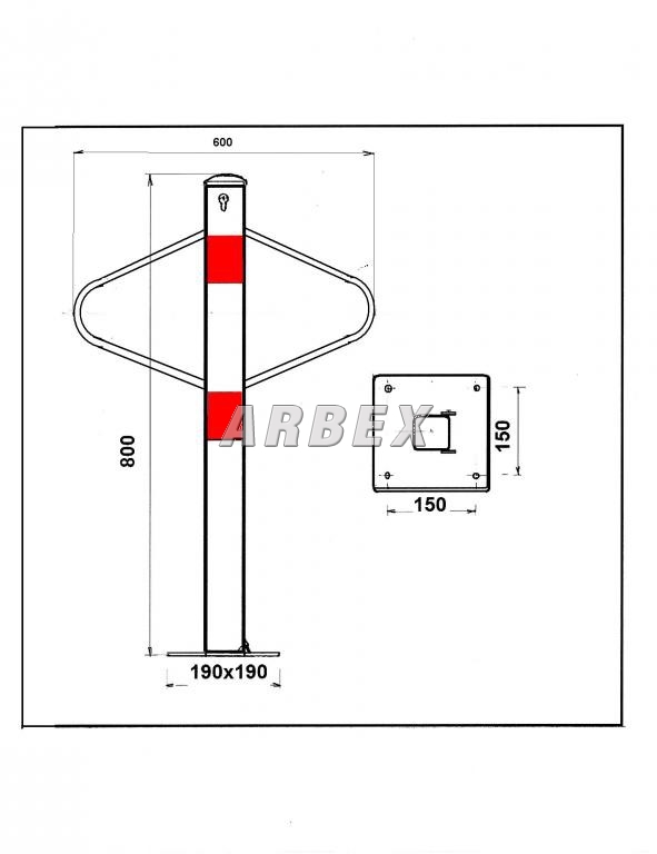 Práškově lakovaný ocelový profil 60x60mm, výšce 800mm a šířce ramen 600mm s žárově zinkovanou základnou 190x190mm se 4 otvory pro kotevní šrouby.