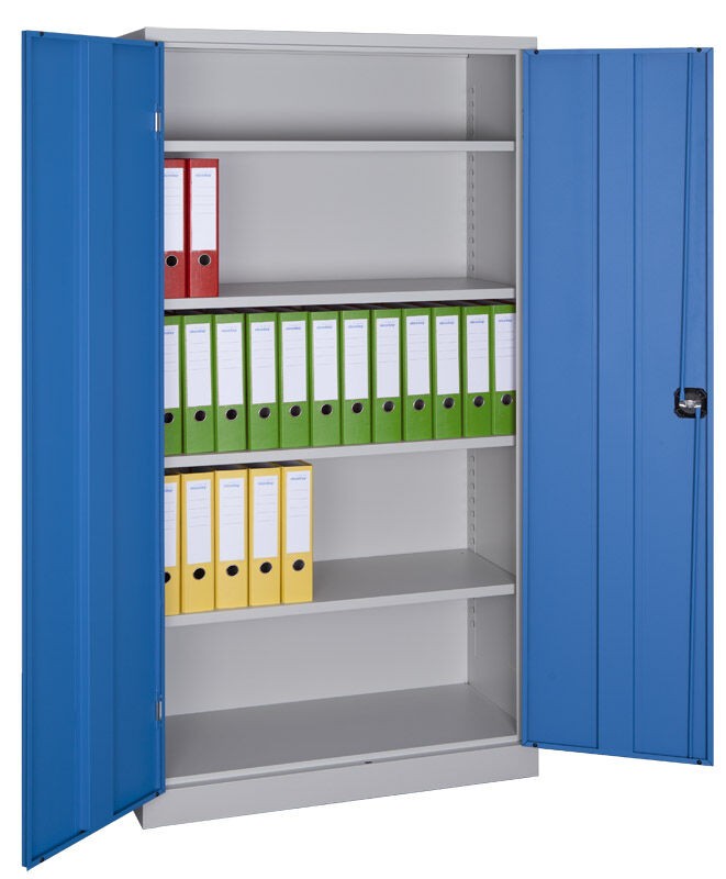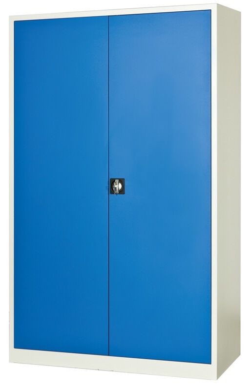 Dvoudveřová skříň s vyztuženými křídly dveří, vnitřní závěsy, úhel otevření dveří 180°.