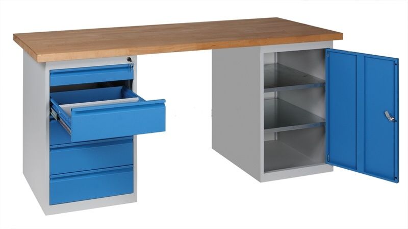 dílenský stůl s 5-zásuvkovým kontejnerem a skříňkou s dvířky/2 police