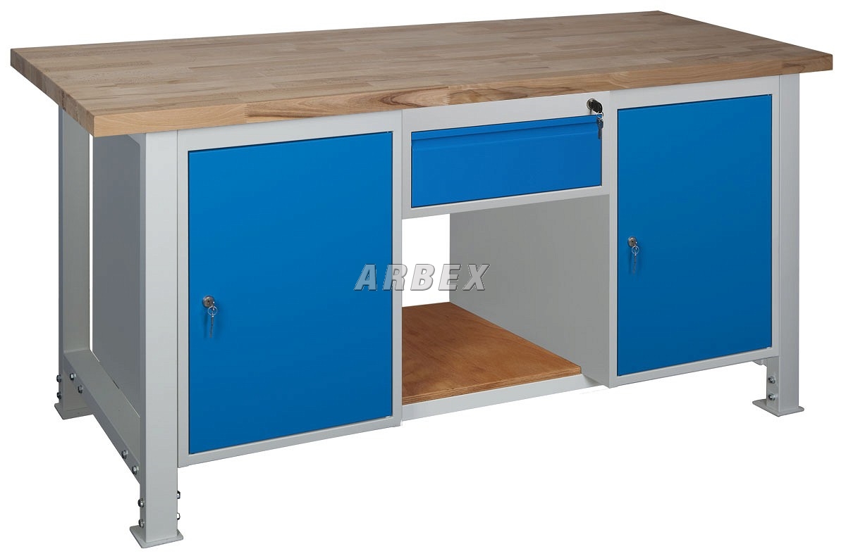 Dílenský stůl s pevnou kovovou konstrukcí, nosnost 500 kg, pracovní plocha buková spárovka tl. 40 mm. Spodní police z bukové překližky tl. 20 mm.