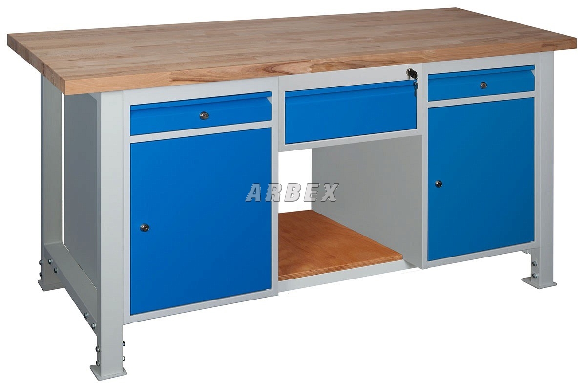 Dílenský stůl s pevnou kovovou konstrukcí, nosnost 500 kg, pracovní plocha buková spárovka tl. 40 mm. Spodní police z bukové překližky tl. 20 mm.