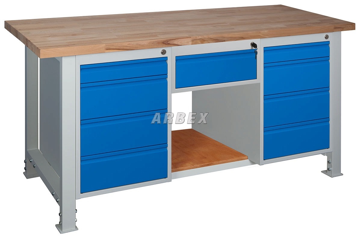 Dílenský stůl s pevnou kovovou konstrukcí, nosnost 500 kg, pracovní plocha buková spárovka tl. 40 mm. Spodní police z bukové překližky tl. 20 mm.