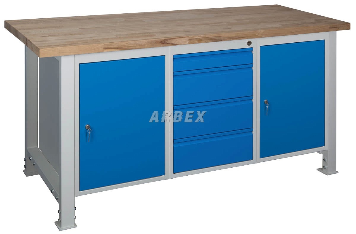 Dílenský stůl s pevnou kovovou konstrukcí, nosnost 500 kg, pracovní plocha buková spárovka tl. 40 mm. Spodní police z bukové překližky tl. 20 mm.