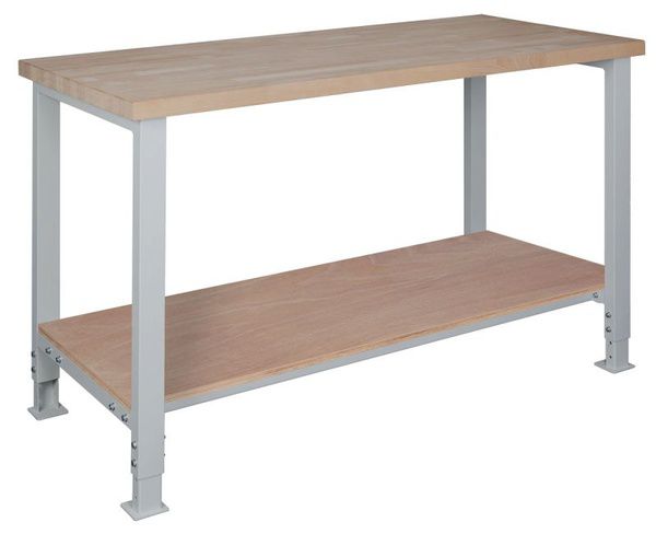 Dílenský stůl s pevnou kovovou konstrukcí, nosnost 500 kg, pracovní plocha buková spárovka tl. 40 mm. Spodní police z bukové překližky tl. 20 mm.