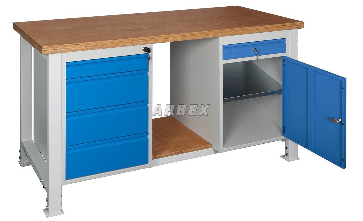Dílenský stůl s pevnou kovovou konstrukcí, nosnost 500 kg, pracovní plocha buková spárovka tl. 40 mm. Spodní police z bukové překližky tl. 20 mm.