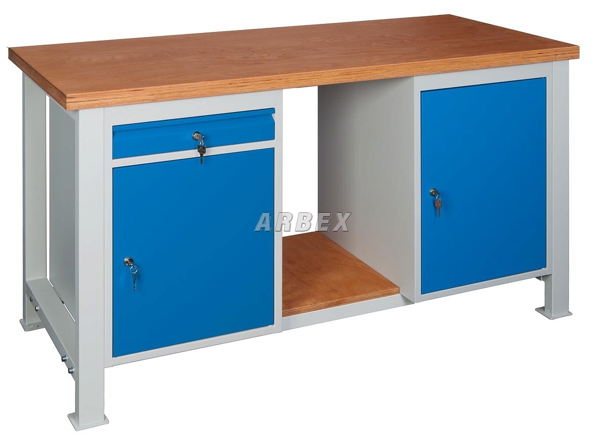 Dílenský stůl s pevnou kovovou konstrukcí, pracovní plocha buková spárovka tl. 40 mm. Spodní police z bukové překližky tl. 20 mm.