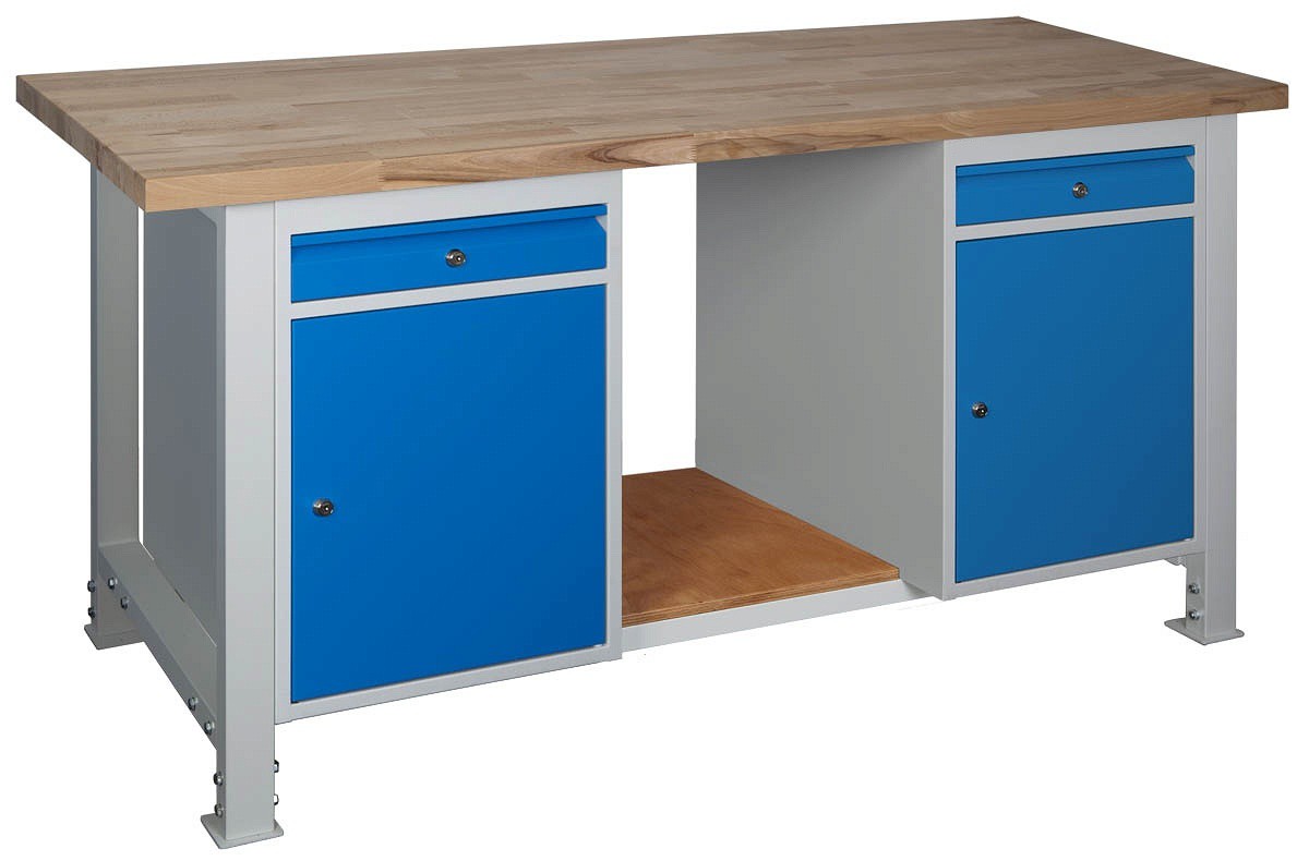 Dílenský stůl s pevnou kovovou konstrukcí, nosnost 500 kg, pracovní plocha buková spárovka tl. 40 mm. Spodní police z bukové překližky tl. 20 mm.