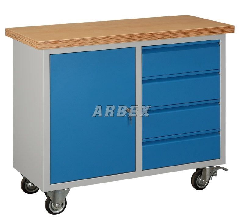 Nosnost zásuvek 45 kg, výsuv 100 %. 2 pevná + 2 otočná kola s brzdou, Ø kol 100 mm.