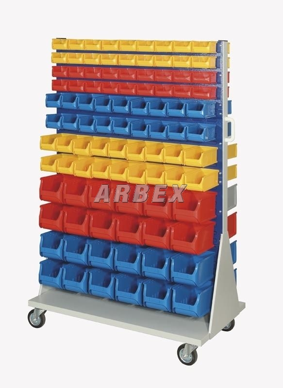 mobilní oboustranný regál s kovovými panely pro zavěšení plastových zásobníků na drobný montážní a spojovací materiál
