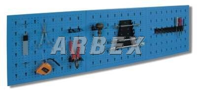 Perforovaný nástěnný panel sloužící k přehlednému zavěšení nářadí.