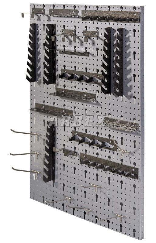 Perforovaný panel slouží k přehlednému uložení dílenského nářadí a materiálu formou zavěšení s využitím doplňkového sortimentu háčků, konzolí a jiných speciálně tvarovaných závěsných prvků.