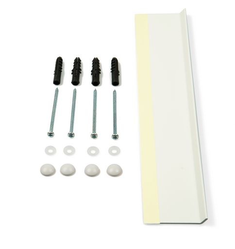 Součástí balení je kompletní montážní sada pro upevnění na zeď a polička na odkládání fixů.