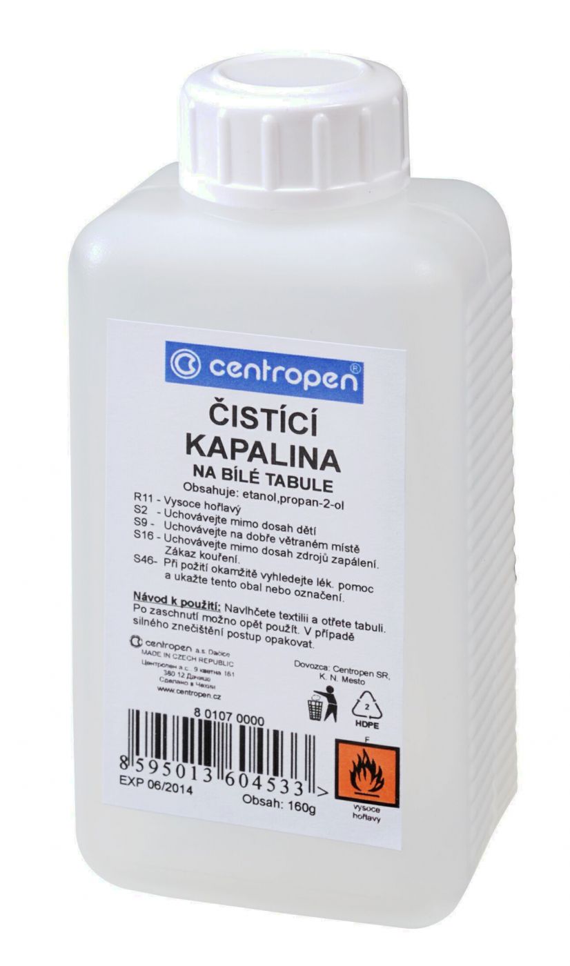 Čisticí kapalina je vhodná na čištění stíratelných tabulí - obsahuje etanol, propan-2-ol. - vysoce hořlavá -,160 g.