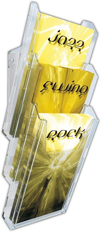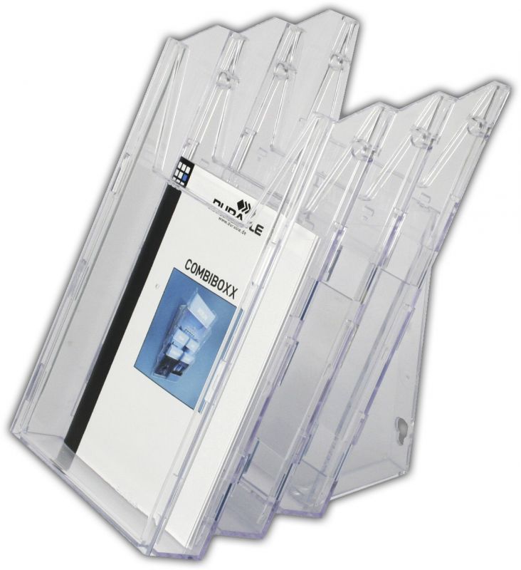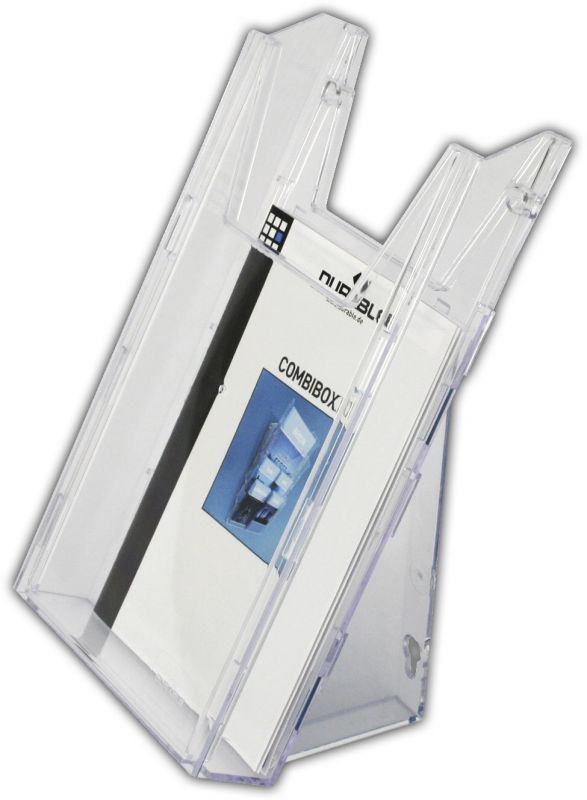 Jednoduchý rozšiřitelný držák na prospekty. Pro formát 1/3 šířky A4. Použití jako stolní i na stěnu . Praktická vyjímatelná přední stěna pro pohodlné čištění. Možno doplnit výrobkem Combiboxx 1/3 A4 extension.