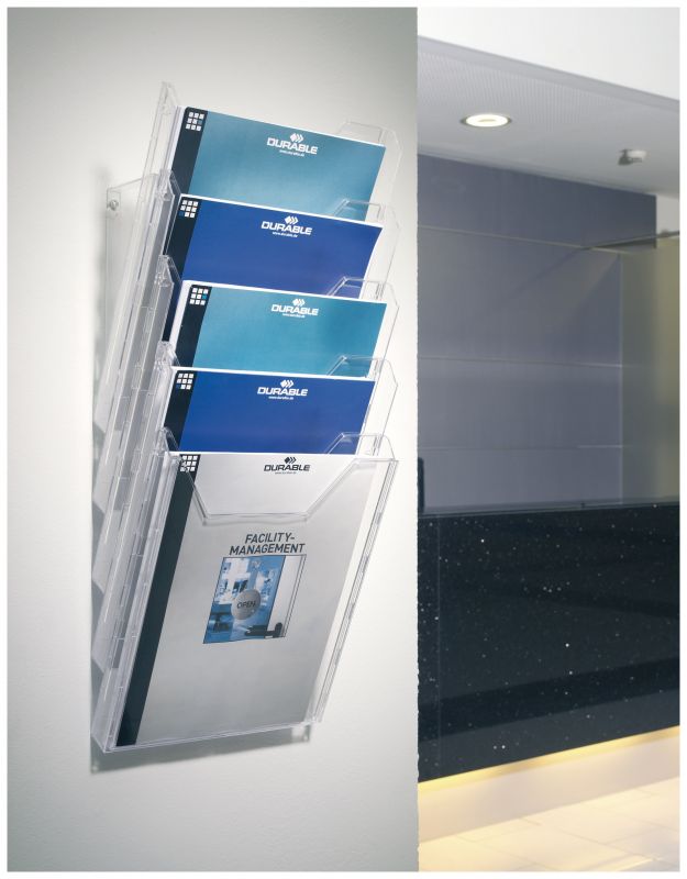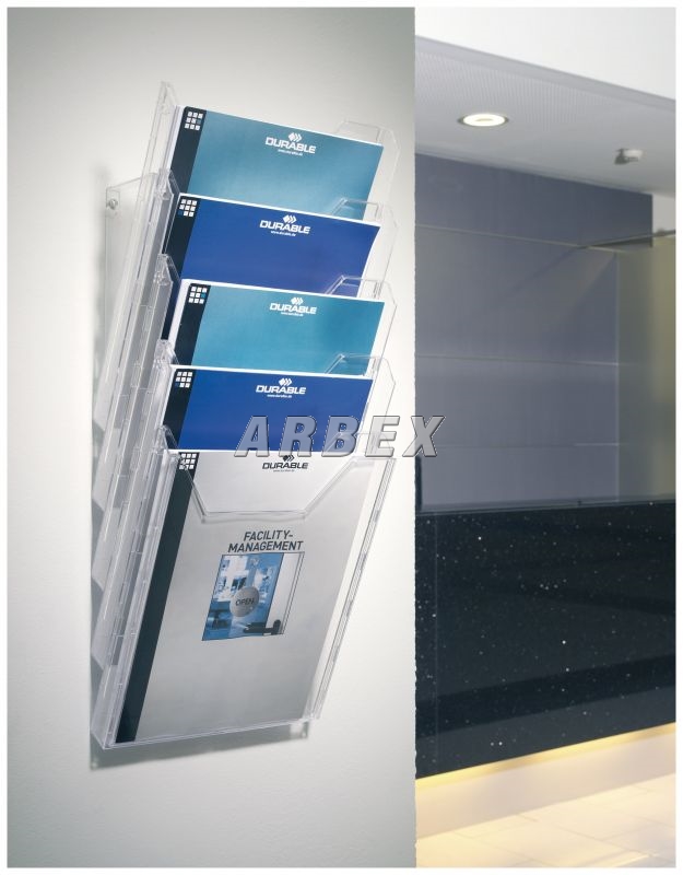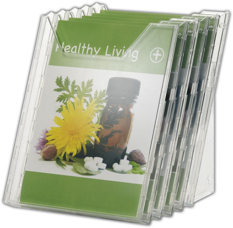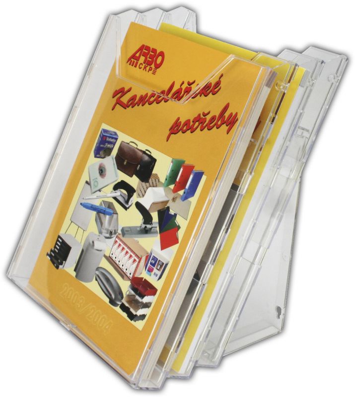 Jednoduchý rozšiřitelný držák na prospekty. Pro tiskoviny až do formátu 311 x 240 mm. Použití jako stolní i na stěnu. Praktická vyjímatelná přední stěna pro pohodlné čištění.