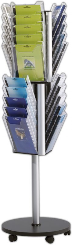 Otočný podlahový stojan se 30 přihrádkami na prospekty až do velikosti 311x240 mm. Ve dvou patrech umístěno po 15 přihrádkách. Jednotlivými patry lze otáčet, pět dvoukoleček umožnuje snadné přemísťování stojanu. Výška 178 cm.