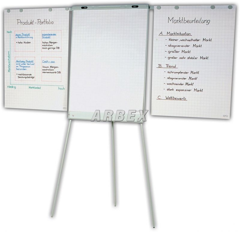 Magnetický flipchart s lakovaným kovovým povrchem , s výklopnými rameny na zavěšení popsaných listů. Je popisovatelný za sucha stíratelnými popisovači. Je výškově nastavitelný do výšky 190cm. Součástí dodávky je sada popisovačů, čtyři magnety a pětilistový blok. Rozměr tabule je 100 x 70 cm.