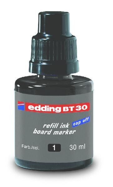 Náhradní inkoust BT 30 pro plnění tabulových popisovačů Edding 250,  361, 365, pro psaní a značkování na bílých tabulích. Smazatelný za sucha téměř ze všech hladkých nepórovitých povrchů jako např. email, sklo, melamin. Stálý na světle a rychle zasychající. Bez přídavku butylacetátu. Obsah 30 ml v lahvičce s kapátkem.