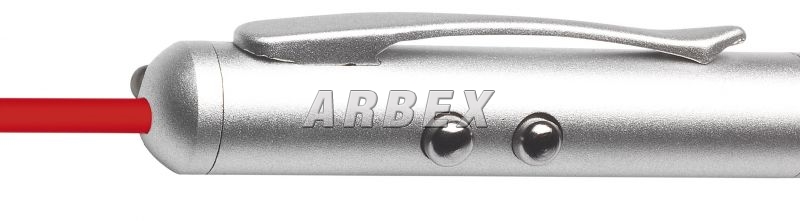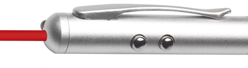 Laserové ukazovátko. LED svítilna. Kuličkové pero. Stylus. Kovové pouzdro. Spotřeba méně než 1 mW.