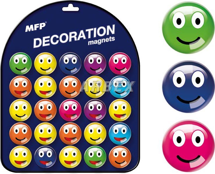 Skleněný, dekorační, kulatý magnet v různých motivech smajlíků, na magnetické tabulce je 25 různých designů.