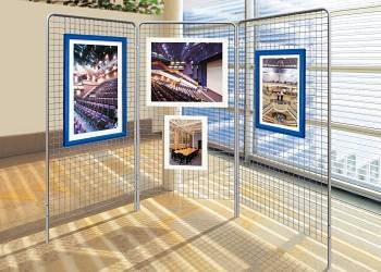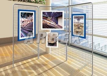 Přenositelná prezentační mříž pro zavěšení vitrín. Rám z ocelové trubky o průměru 25 mm s drátěnými oky 50x50 mm. Mříž se dodává po třech polích o rozměru 1000 x 25 x 2000 mm, se šesti spojovacími klipy a s dvanácti háčky na zavěšení vitrín. Mříž je lakovaná kovově šedou barvou.