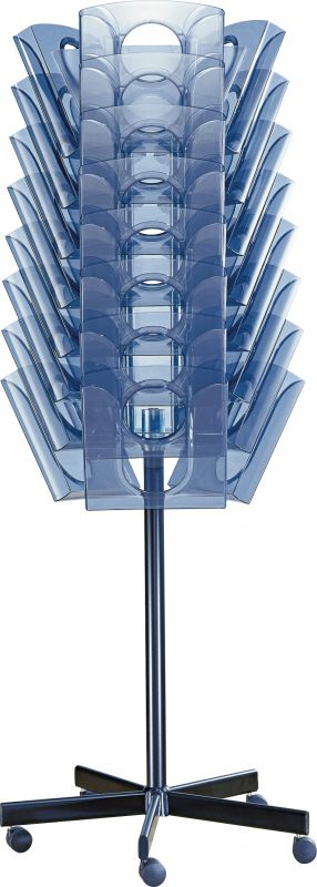 Pojízdný otočný stojan černé barvy. 24 odkladačů. Výška stojanu včetně odkladačů 156 cm.